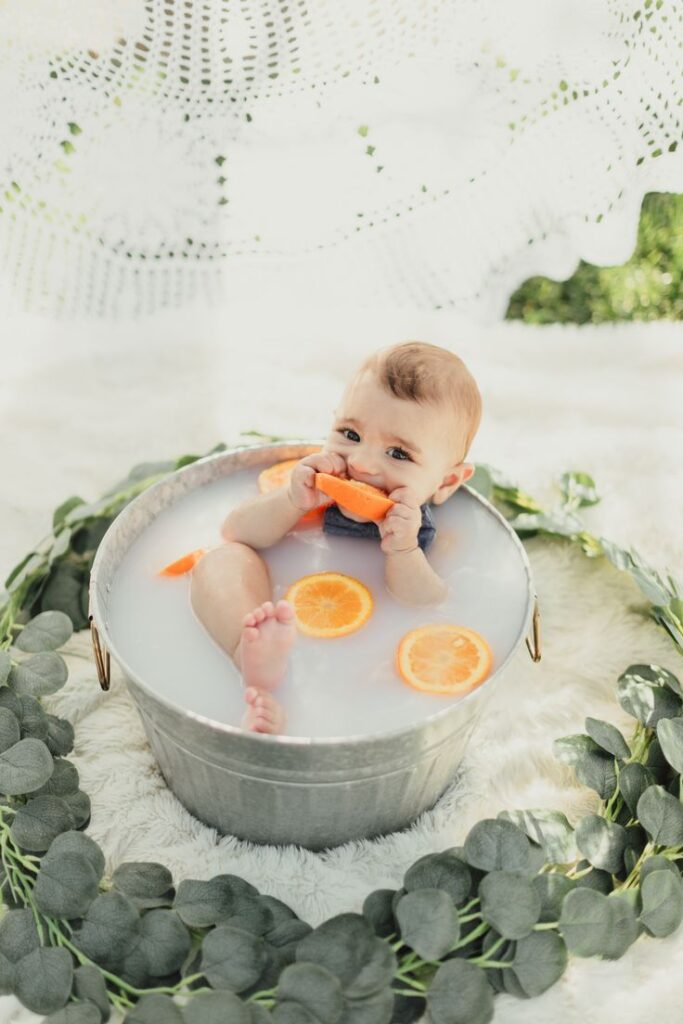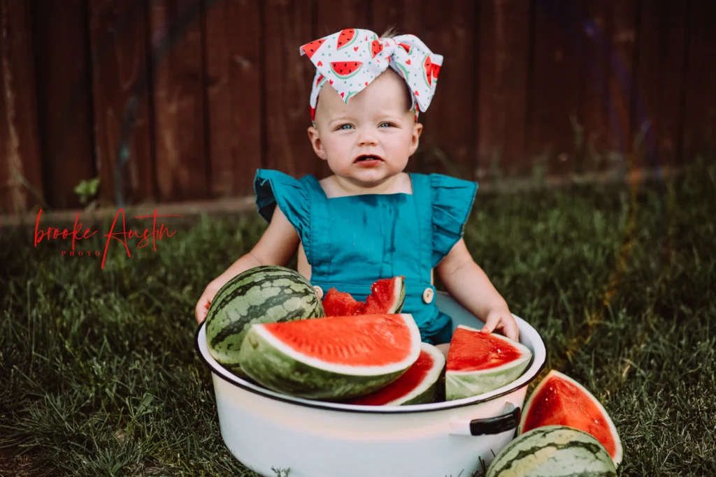Summer fruits add bright colors to photos. You can place slices of watermelon, oranges, or lemons around the baby for a playful look. Always supervise closely and keep food safe. This is one of the most loved creative summer baby photoshoot ideas because it feels fresh and cheerful.